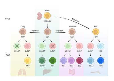 ILC是具有组织驻留特性的异质性群体(包含ILC1、ILC2和ILC3),对机体抵抗病原体、抗肿瘤及免疫调节等具有重要作用。近年来,田志刚教授课题组发现肝脏驻留NK细胞(后续国际命名为ILC1)由肝脏原位造血前体细胞产生,提示ILC存在独立于骨髓造血的起源路径。