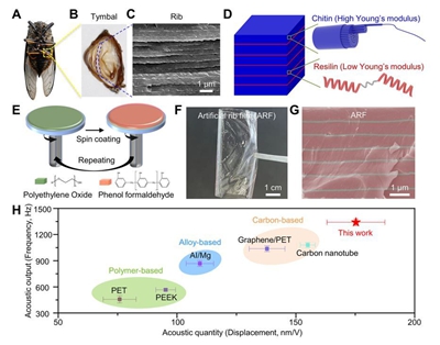 开发综合性能优异、适用于高性能声学换能器的薄膜材料,是当前面临的重要技术挑战。针对该问题,本研究解析了蝉发声器官——蝉肋骨膜的结构与性能关系,并据此仿生制备出可用于声学换能器的高性能仿生薄膜。