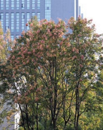 栾树花花朵虽小,但盛开时,它们连成一片,随风舞动,如片片祥云,金色灿烂,绚丽如霞,蔚为壮观,令人心旷神怡。这高大粗壮的树干,使成片的、沉甸甸的花朵们有了坚实的依靠,它们高兴地、尽情地在半空中伸展着、扭动着。
