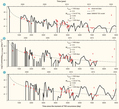 随着时域天文的不断发展,潮汐撕裂恒星事件越来越受到关注。钱德拉南天深场是迄今为止曝光时间最长(约七百万秒),从而最深、最灵敏的X射线巡天。研究团队在钱德拉南天深场中发现了一例光变非常有趣的X射线暂现源(即突然变亮从而被探测到、随后变暗直至无法探测的天体;被取名为XID 935),其所有的X射线观测时间跨度接近20年。和光学图像对比,XID 935的位置位于其宿主星系(距离我们约42亿光年)中心,表明它很有可能和中心的超大质量黑洞有关,但通过研究其光谱发现,它并没有活动星系核的光谱特征。另外一种可能是,它是作为前景的银河系内的X射线双星,只不过偶然在我们的视线上与远处的星系中心重合,但通过计算可以发现,X射线双星发生这种事件的概率微乎其微。于是,XID 935最合理的解释就是潮汐撕裂恒星事件,因为别的暂现源图像都无法与观测相符。并且它是所有已知X射线潮汐撕裂恒星事件中最为暗弱的一例,要不是钱德拉南天深场具有极高的灵敏度,它根本就不会被探测到。通常来说,潮汐撕裂恒星事件的光度在达到峰值后会呈现单调幂律下降的趋势。XID 935的光变之所以有趣,是因为它的光度在整体下降(近20年间变暗超过40倍直至无法探测到)的过程中,还出现了突然变暗又变亮(两个月内变亮超过27倍)的情况,预示着这可能是一例发生在超大质量双黑洞系统中的潮汐撕裂恒星事件——这样的事件非常罕见,之前仅有两例候选体,但它们的数据质量都远不如XID 935,且距离我们都要近得多。与普通的单黑洞潮汐撕裂恒星事件不同,当一颗恒星被主黑洞撕裂,恒星残骸流可能会被次黑洞干扰,导致无法正常回落到主黑洞,物质供给的中断导致光度骤然下降;当次黑洞远离后,恒星残骸流又能正常回落到主黑洞,于是主黑洞继续吸积残骸从而恢复光度(如图所示)。