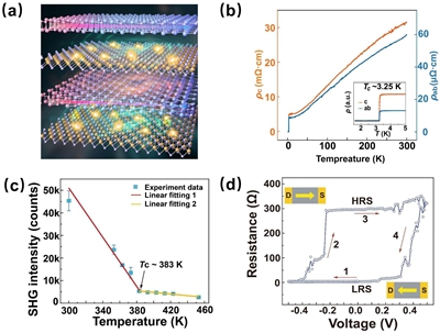 图:(a)范德华超晶格(SnSe)1.16(NbSe2)示意图,展示了铁电层和金属层的交替堆叠结构;(b)该晶体面内方向和面外方向的变温电输运,展示了良好的金属性和超导电性;(c)温度依赖的非线性光学二次谐波效应和铁电居里温度;(d)铁电忆阻效应,高低电阻态被小电压脉冲所切换。