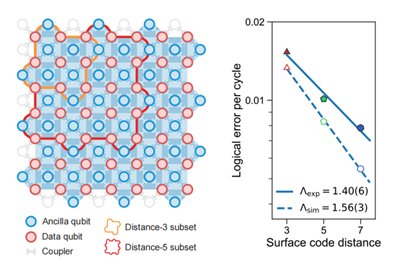 左图:随着码距从3(橙色框内比特)增大到5(红色框内比特)再到7(所有彩色标注比特),右图:逻辑错误率指数下降。