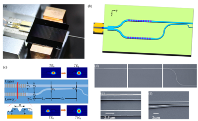 图1:(a) 电泵浦偏振纠缠光子源实物图;(b) 混合集成示意图;(c) 波导结构与光场模式分布;(d) 薄膜铌酸锂芯片扫描电镜图;(e) 双通道PPLN波导电镜图;(f) 偏振旋转合束器电镜图。