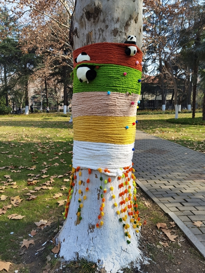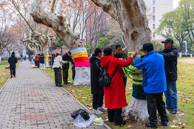 活动中,代际互动温情满满。老同志们布满岁月痕迹的双手与青年学子充满活力的双手默契配合,缠绕、打结、装饰等一系列动作有条不紊,草坪上不时响起欢声笑语。原本光秃的梧桐树干逐步被色彩艳丽、样式繁多的“冬装”包裹,不仅有效提升了树木防寒能力,更成为校园内独具特色的创意景观,吸引众多师生驻足打卡。