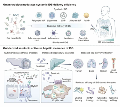 研究首次勾勒出完整的肠—肝免疫调控轴:肠道共生菌激活肠道上皮内分泌系统促进血清素分泌,血清素进而激活肝脏Kupffer细胞,增强其对递送载体的吞噬能力,导致载体循环受损、递送效率下降。