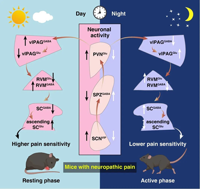 更关键的是,由于受到SCN昼夜节律性活动的调控,这条神经环路上的神经元,白天和晚上的活跃程度完全不同,像调节音响音量一样,精准控制脊髓传递的痛觉信号强弱。SCN白天更兴奋,驱动这条环路把痛觉音量拉满;而到了夜间,SCN活动减弱,痛感也自然降低。正是这种昼夜不一样的活动状态,让疼痛敏感性跟着昼夜起伏。团队还发现,当在白天或晚上人为调节这些神经元的活动时,小鼠原本的疼痛昼夜差异竟然消失了。这些结果表明,正是这条神经环路的节律性活动,造成了我们白天和晚上的痛感天差地别。