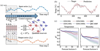 图:(a) 量子储层计算示意图;(b) 单步气温预测实验结果;(c) 经典网络与量子储层在多步预测中的性能对比。