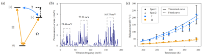 图:(a)VB-色心简化的基态三重态,∣0〉⟷∣±〉的弛豫速率记作Ω,∣+〉⟷〡-〉的弛豫速率记作γ;(b)VB-色心的声子态密度图像,选取三个峰值为有效声子模式;(c)温度依赖的Ω和γ拟合曲线与理论计算曲线的对比。